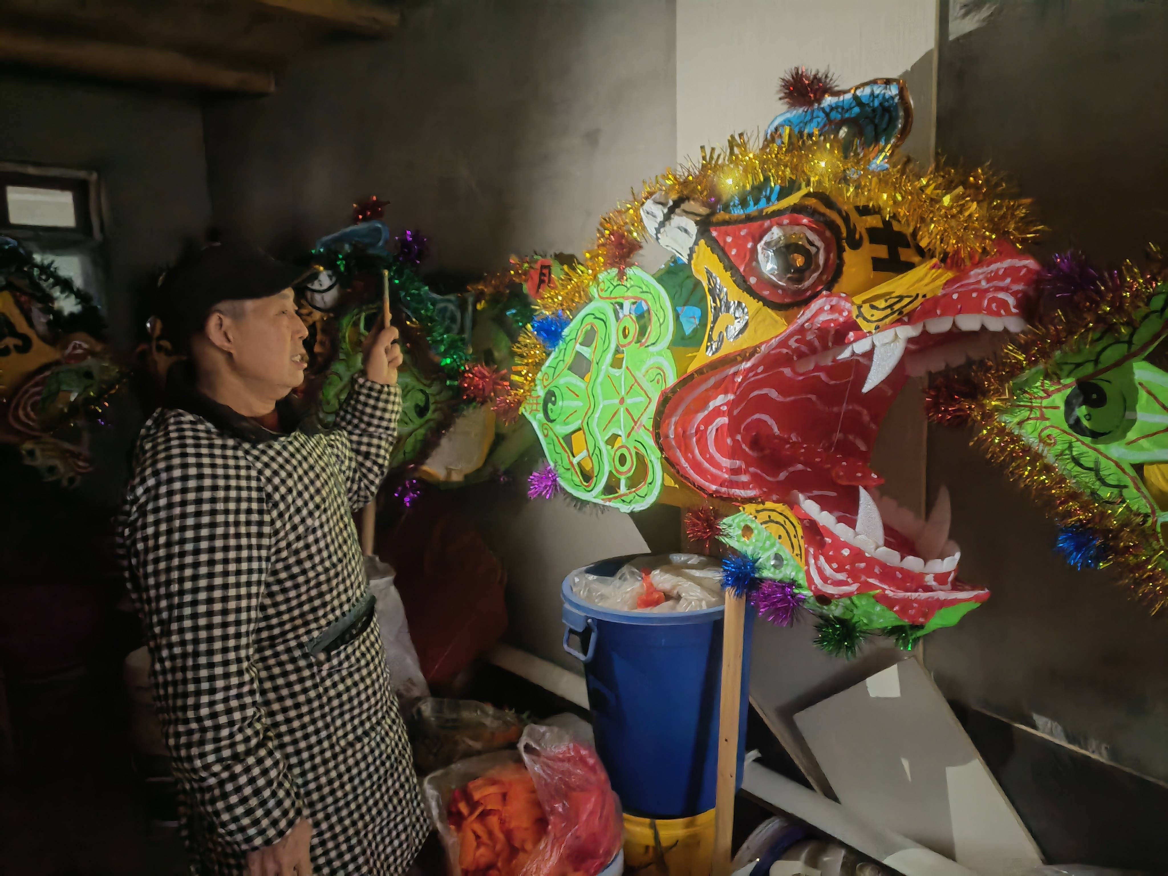 小时候,杨秀举跟着父亲学如何编扎毛龙。如今92岁的父亲杨胜和,尽管很少动手编扎,但依然是儿子的“资深顾问”。