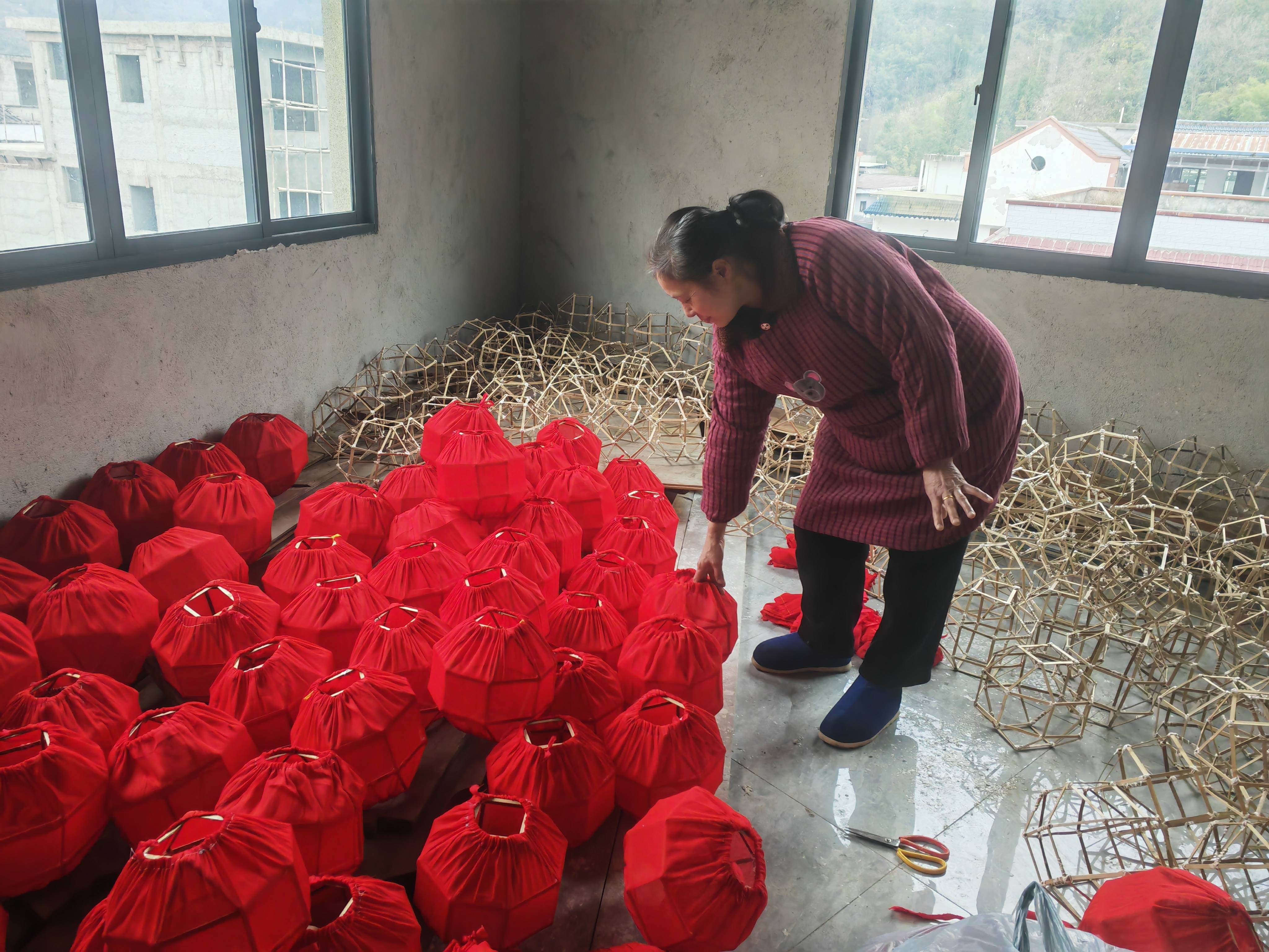 在石阡县汤山街道,78岁的代尚福和他的儿子代鑫正忙着编扎毛龙。在他们的工作室院子里,一条约20米长的“仡佬毛龙”色彩鲜艳、神形逼真,竹篾作骨架,彩纸绕身缠。大大小小的房间里,堆满了竹子、灯把、八方灯球等配件。