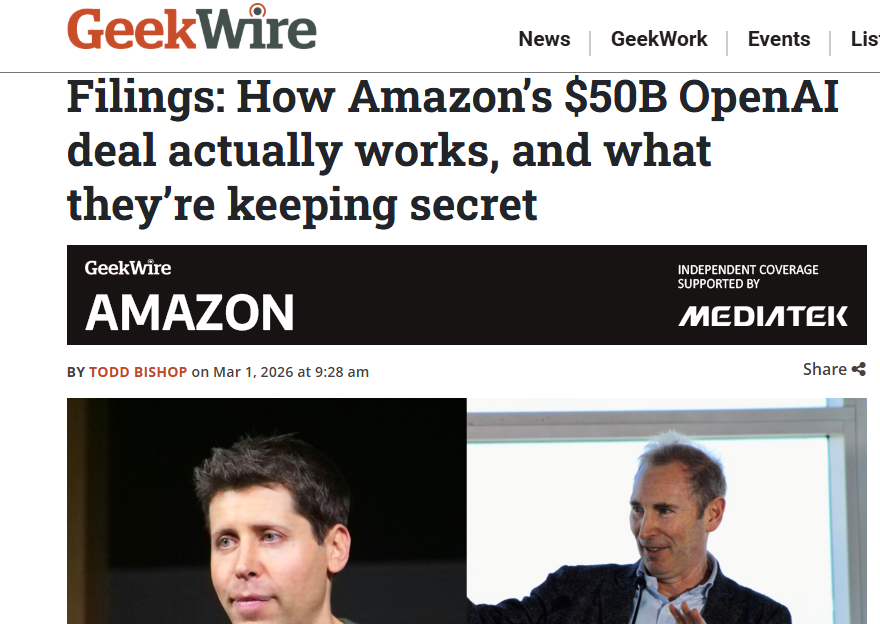 【环球网科技综合报道】3月2日,据GeekWire 报道,亚马逊与OpenAI 500亿美元合作的SEC文件细节在近日曝光,交易分两阶段推进,同步绑定云合作,背后暗藏未公开条款,标志AI行业独家合作时代落幕。