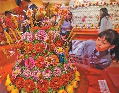 “食为天”着眼于大食物观,通过种植、存储、加工、分享等角度,展现非遗保护、春节习俗与粮食安全的密切关系。中心区域高达4.5米、直径3.6米的面花作品《大鼓枣山》,由18人历时一个月制作而成,呈现了陕西澄城面花的精湛技艺。在它周围,还簇拥着山西岚县面塑《孔雀牡丹》《年年有余》、山西闻喜花馍《龙凤呈祥》等,将我国北方地区面食制作的“十八般武艺”展现得淋漓尽致。